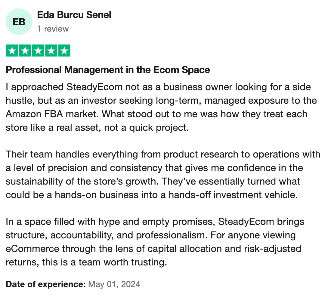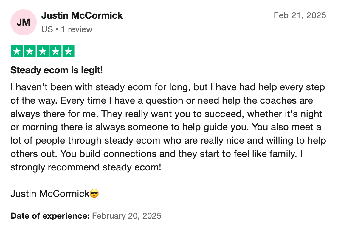 At Steady Ecom, we don’t just help you build Amazon FBA businesses we teach you how to manage it successfully with expert support. From sourcing products and setting up your account to warehousing and fulfillment systems, we break down each step and guide you through the entire process. With our proven frameworks and hands-on mentorship, you’ll gain the skills, confidence, and systems to run a high-performing Amazon FBA operation even without prior experience. Our approach is designed for serious people and entrepreneurs who want to own their results, change their life, and scale sustainably.